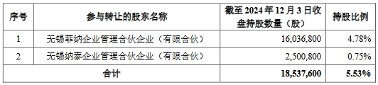 截至2024年12月3日收盘,无锡菲纳企业管理合伙企业(有限合伙)持股数量为16,036,800股,持股比例4.78%;无锡纳泰企业管理合伙企业(有限合伙)持股数量为2,500,800股,持股比例0.75%。
