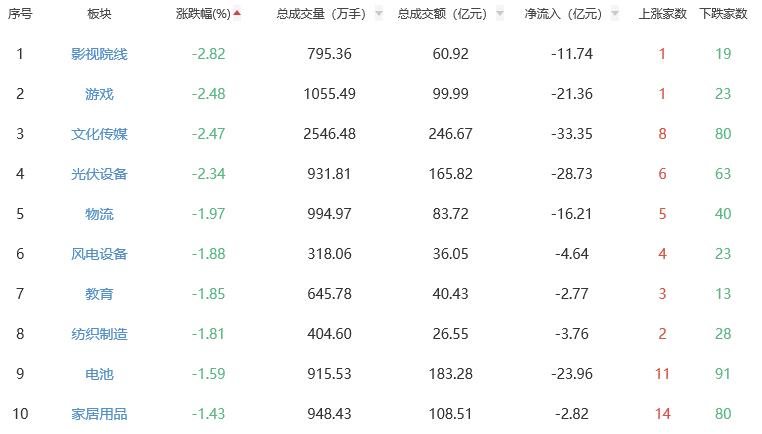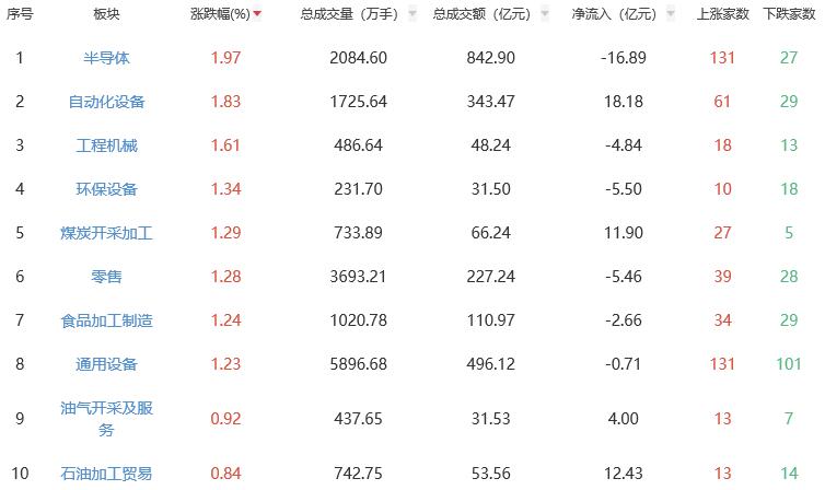板块方面,半导体、自动化设备、工程机械等涨幅居前,影视院线、游戏、文化传媒等跌幅居前。