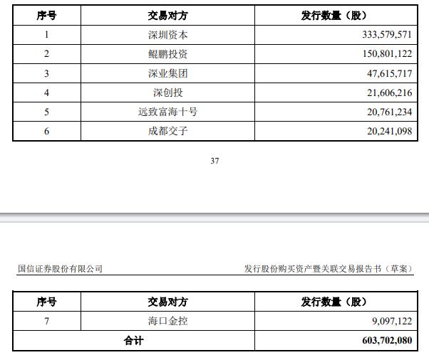公告显示,截至2024年9月30日,国信证券总股本9,612,429,377股。根据最终确定的交易金额,本次交易拟向交易对方发行603,702,080股。本次交易完成后,国信证券总股本将增加至10,216,131,457股。本次交易前后,国信证券控股股东均为深投控,实际控制人均为深圳市国资委,本次交易不会导致上市公司控制权变更。