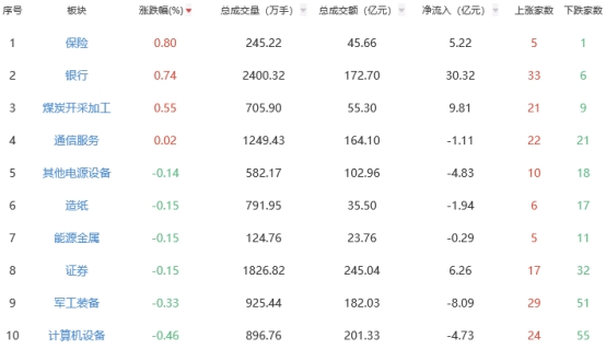 板块方面,银行、保险、煤炭开采加工、通信服务板块上涨,种植业与林业、旅游及酒店、贸易、饮料制造等板块跌幅居前。