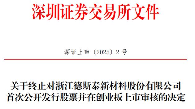 中国经济网北京1月5日讯 深交所网站1月3日发布关于终止对浙江德斯泰新材料股份有限公司(简称“德斯泰”)首次公开发行股票并在创业板上市审核的决定。