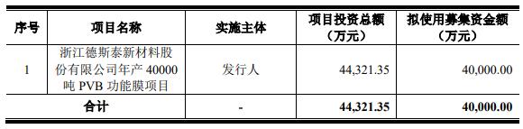 德斯泰原拟在深交所创业板公开发行股票不超过2,350.6637万股,全部为新股发行。德斯泰原拟募集资金4亿元,用于浙江德斯泰新材料股份有限公司年产40000吨PVB功能膜项目。