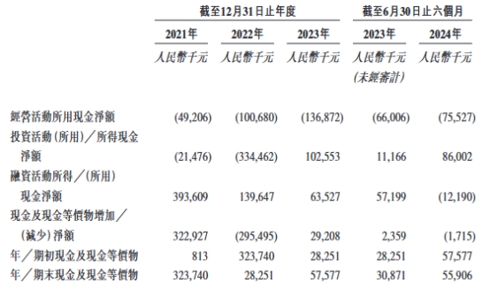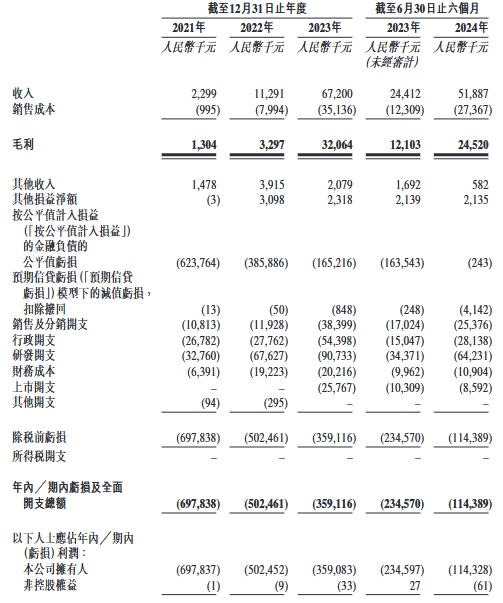 2021年、2022年、2023年及截至2024年6月30日止六个月,公司的收入分别为2.3百万元、11.3百万元、67.2百万元、51.9百万元;年内/期内亏损及全面开支总额分别为697.8百万元、502.5百万元、359.1百万元、114.4百万元,累计已亏损1,673.8百万元。
