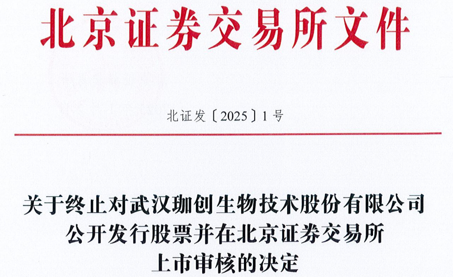 北交所于2024年6月27日受理了珈创生物提交的公开发行相关申请文件,并按照规定进行了审核。2024年12月25日,珈创生物向北交所提交了《武汉珈创生物技术股份有限公司关于撤回向不特定合格投资者公开发行股票并在北交所上市申请文件的申请》,申请撤回申请文件。根据《北京证券交易所向不特定合格投资者公开发行股票并上市审核规则》第五十五条的有关规定,北交所决定终止珈创生物公开发行股票并在北京证券交易所上市的审核。