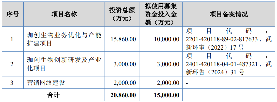 珈创生物原拟在北交所发行股票数量为不超过13,538,462股(未考虑超额配售选择权),不超过15,569,231股(含行使超额配售选择权)。公司原拟募集资金15,000.00万元,用于珈创生物业务优化与产能扩建项目、珈创生物创新研发及产业化项目、营销网络建设。