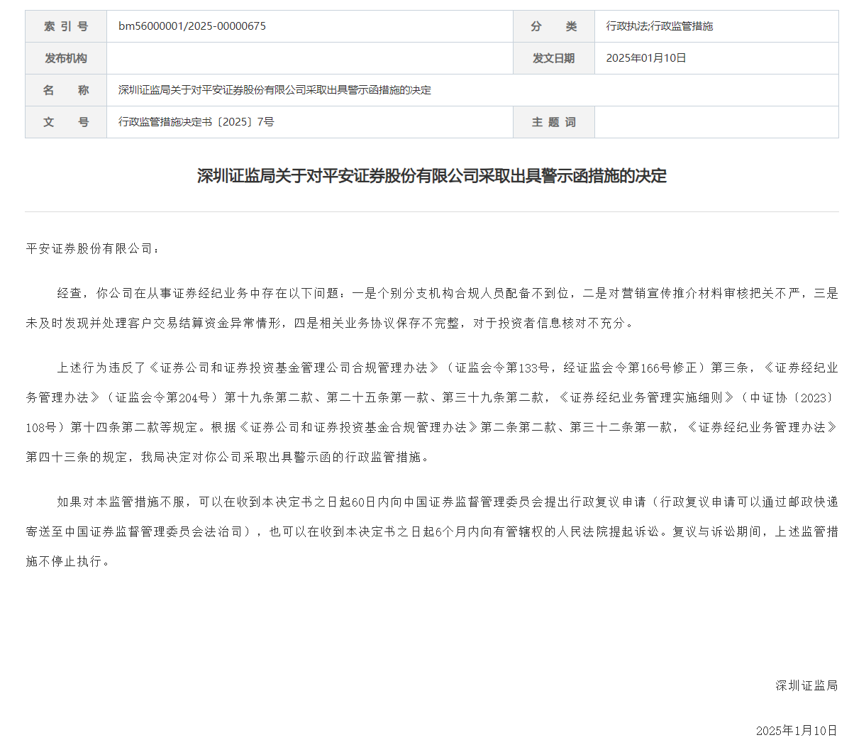 上述行为违反了《证券公司和证券投资基金管理公司合规管理办法》(证监会令第133号,经证监会令第166号修正)第三条,《证券经纪业务管理办法》(证监会令第204号)第十九条第二款、第二十五条第一款、第三十九条第二款,《证券经纪业务管理实施细则》(中证协〔2023〕108号)第十四条第二款等规定。根据《证券公司和证券投资基金合规管理办法》第二条第二款、第三十二条第一款,《证券经纪业务管理办法》第四十三条的规定,深圳证监局决定对平安证券股份有限公司采取出具警示函的行政监管措施。