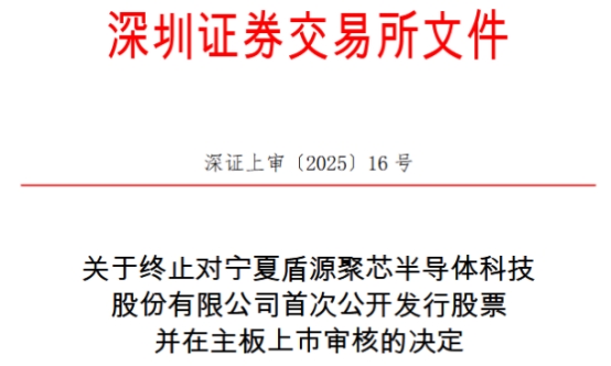 日前,盾源聚芯向深交所提交了《宁夏盾源聚芯半导体科技股份有限公司关于撤回首次公开发行股票并在主板上市申请文件的申请》,保荐人向深交所提交了《东方证券股份有限公司关于撤回宁夏盾源聚芯半导体科技股份有限公司首次公开发行股票并在主板上市申请文件的申请》。根据《深圳证券交易所股票发行上市审核规则(2024年修订)》第六十二条的有关规定,深交所决定终止对盾源聚芯首次公开发行股票并在主板上市的审核。