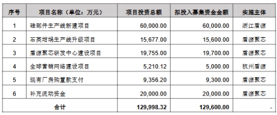 盾源聚芯原拟在深交所主板发行股票不超过6,238.1174万股,且发行股票数量占公司发行后总股本的比例不低于25%。公司原拟募集资金129,600.00万元,分别用于硅部件生产线新建项目、石英坩埚生产线升级项目、盾源聚芯研发中心建设项目、全球营销网络建设项目、现有厂房购置款支付、补充流动资金。