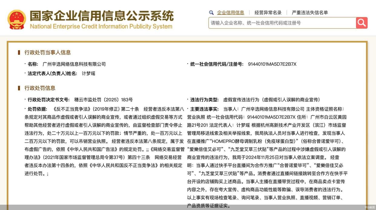 辛巴又一次被罚。根据广州市白云区市场监督管理局的行政处罚决定书内容,违法事实显示,当事人即广州辛选网络信息科技有限公司通过快手平台直播间为合作方推广“合普诺爱毕可”“爱樂倍佳艾必可”“九芝堂艾草三伏贴”等产品。消费者通过直播间链接跳转至合作方在快手平台开设的店铺购买上述产品。当事人主播在直播带货过程中,在商品卖点卡宣传内容之外,存在夸大宣传、虚构商品功能性能等欺骗、误导消费者的违法行为。