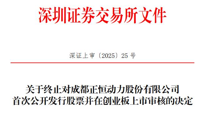 日前,正恒动力向深交所提交了《成都正恒动力股份有限公司关于撤回首次公开发行股票并在创业板上市申请文件的申请》,保荐人向深交所提交了《东吴证券股份有限公司关于撤回成都正恒动力股份有限公司首次公开发行股票并在创业板上市申请文件的申请》。根据《深圳证券交易所股票发行上市审核规则(2024年修订)》第六十二条的有关规定,深交所决定终止对正恒动力首次公开发行股票并在创业板上市的审核。