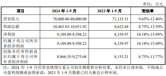 公司预计2024年1-9月实现营业收入78,000.00万元至80,000.00万元,同比增长9.65%至12.46%;净利润/归属于母公司所有者的净利润9,189.09万元至9,598.22万元,同比增长10.18%至5.09%;扣除非经常性损益后归属于母公司所有者的净利润8,866.55万元至9,275.68万元,同比增长8.75%至13.77%。