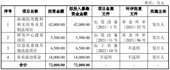 公司本次募集资金将投资于高端医用敷料和无纺布及其制品项目、研发中心建设项目、信息化系统升级改造项目以及补充流动资金。