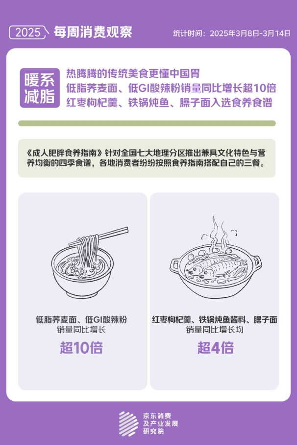 营养学家指出,这种“本土化饮食改造”既有营养学上的科学依据,又充分考虑了中国人的口味和饮食习惯,更容易被大众接受和长期坚持。有陕西网友留言:“终于不用含泪啃草,臊子面也能吃出小蛮腰!”近一周,低脂荞麦面、低GI酸辣粉的销量同比增长超10倍,红枣枸杞羹、铁锅炖鱼酱料、臊子面的销量同比增长均超4倍。