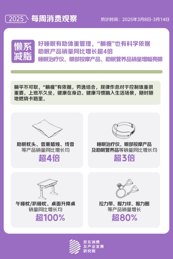 规律作息对于体重管理十分重要。《指南》中强调,经常熬夜、睡眠不足、作息无规律可引起内分泌紊乱,脂肪代谢异常,增加肥胖风险。“听劝”的网友纷纷下单购买各类助眠产品,助眠枕头、香薰蜡烛、线香等产品销量同比增长均超4倍,睡眠治疗仪、眼部按摩产品及助眠营养品等销量同比增长均超3倍。职场人士买走了更多的午睡枕/趴睡枕,销量同比增长超100%。