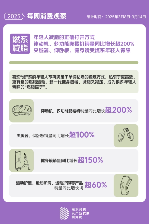 喜欢“燃”系的年轻人不再满足于单调枯燥的锻炼方式,热衷于更高效、更有趣的燃脂运动。新一代健身器械,减脂又减压,成为很多年轻人青睐的“燃脂搭子”。过去一周,律动机及多功能爬楼机的销量同比增长超200%,锻炼身体局部的装备如夹腿器(腿部)、仰卧板(腰腹)的销量同比增长超100%,健身镜的销量同比增长也超150%。同时运动防护装备也热销,如运动护腿、运动护肩、运动护踝等产品销量同比增长均超60%。在选购“夹腿器”时,消费者会更加关注与腿部的贴合度、升级计数功能以及降噪静音。