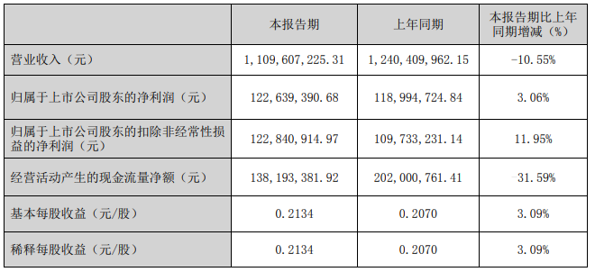 2025年一季度,公司营业收入为11.10亿元,同比下滑10.55%;归属于上市公司股东的净利润为1.23亿元,同比增长3.06%;归属于上市公司股东的扣非归母净利润为1.23亿元,同比增长11.95%;经营现金流净额为1.38亿元,同比增长31.59%。