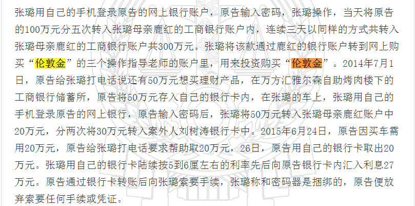 近日,中国裁判文书网披露的一则民事判决书显示,中国工商银行建平支行客户经理张璐以办理理财产品为由,诈骗辽宁建平县农民马玉芹350万元。不过,令人吃惊的是,张璐又将诈骗来的300万元通过别人的银行账户、用来投资购买“伦敦金”,结果中了骗子的圈套,张璐不仅没有赚到钱,反而被骗光了所有投资款。法网恢恢疏而不漏!最终,张璐被判处有期徒刑15年。