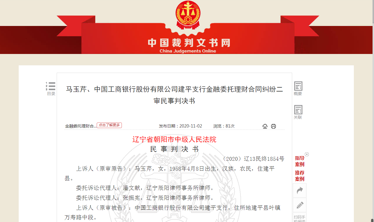 最终,辽宁省朝阳市中级人民法院二审判定,马玉芹承担资金损失中60%的责任,工行建平支行承担40%的赔偿责任。此外,二审案件受理费4.9万元,由马玉芹负担3.3万元,由工行建平支行负担1.6万元。