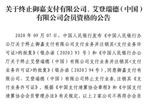 公告透露,2020年9月7日,中国人民银行发布相关批复,同意御嘉支付、艾登瑞德(中国)终止支付业务,注销其《支付业务许可证》。
