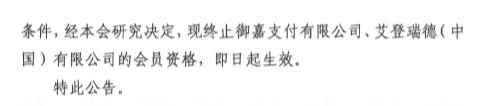 中国支付清算协会表示,根据有关规定,以上2家公司不再符合会员条件,经本会研究决定,现终止御嘉支付、艾登瑞德(中国)的会员资格,即日起生效。
