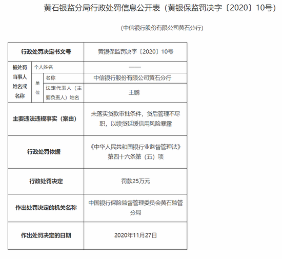 12月4日消息,黄石银保监分局公布的行政处罚信息公开表显示,中信银行股份有限公司黄石分行因未落实贷款审批条件,贷后管理不尽职,以续贷延缓信用风险暴露,被处罚款25万元。