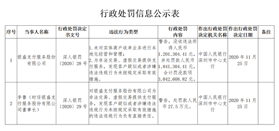 12月8日消息,人民银行深圳市中心支行公布的行政处罚信息公示表显示,银盛支付服务股份有限公司因未对实体商户收单业务进行本地化经营和管理;为非法交易、虚假交易提供支付服务,发现客户疑似或者涉嫌违法违规行为未按规定采取有效措施,受到警告处分,被没收违法所得120.13万元,并处罚款184.13万元,合计罚没款项304.26万元。