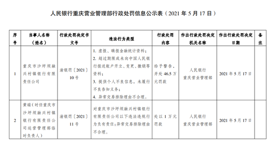 5月31日消息,央行重庆营业部公开行政处罚公示,重庆市沙坪坝融兴村镇银行有限责任公司因4项违规给予警告,并处罚款46.5万。