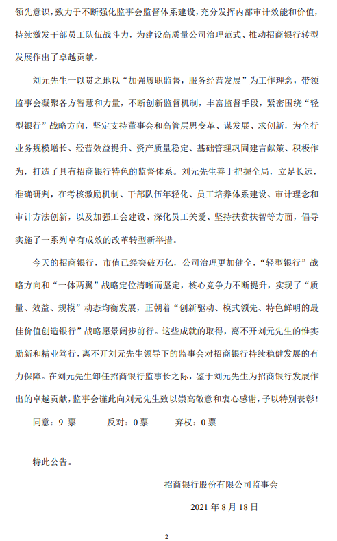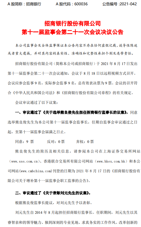 8月18日消息,招商银行发布公告,监事会审议通过了《关于选举熊良俊先生担任招商银行监事长的议案》,同意选举熊良俊为公司第十一届监事会监事长,任期自监事会审议通过之日起,至第十一届监事会届满之日止。