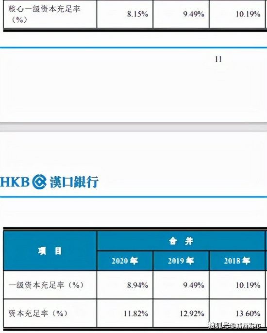 实际上,汉口银行面临着较大的资本补充压力。历年年报数据显示,2018-2020年间,汉口银行资本充足率分别为13.60%、12.92%、11.82%。一级资本充足率分别为10.19%、9.49%、8.94%;核心一级资本充足率分别为10.19%、9.49%、8.15%。已逐渐逼近监管红线。