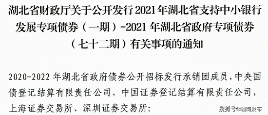 中国债券信息网披露显示,2021年湖北省支持中小银行发展专项债(一期)-2021年湖北省政府专项债券(七十二期)品种为记账式固定利率附息债券,债券期限为10年期,计划发行金额37亿元,每半年付息一次,本金分年偿还,在债券存续期的第6至10年每年分别偿还本金的20%,此批债券将通过全国银行间债券市场、证券交易所债券市场公开发行。