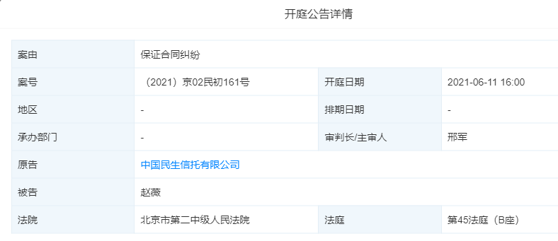 此外,值得一提的是,今年6月11日,中国民生信托起诉赵薇一案,已于北京市第二中级人民法院第45法庭开庭审理。该案被告为赵薇、合宝文娱集团有限公司,案由同样为保证合同纠纷。