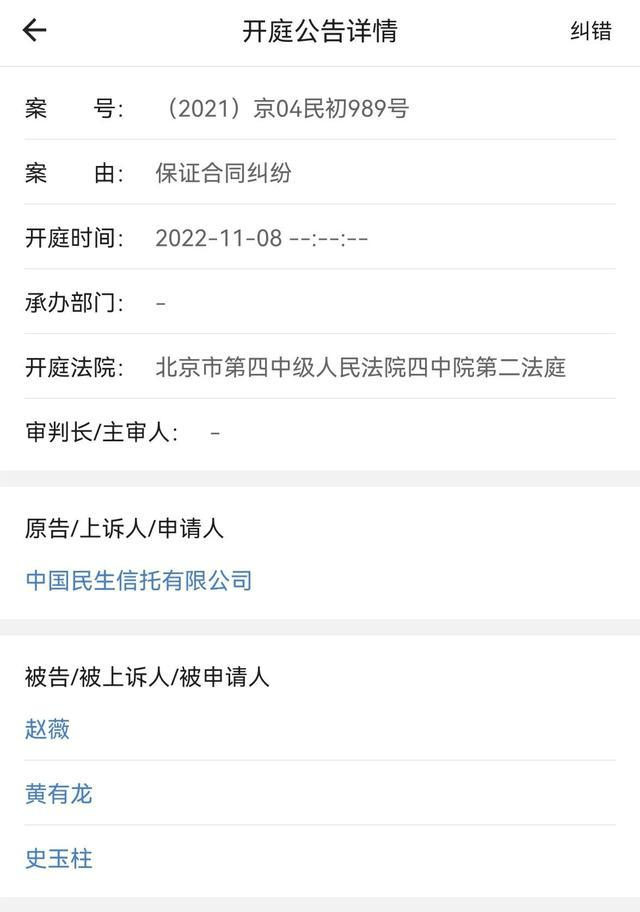 10月9日,中国民生信托有限公司新增开庭公告,上诉人/原告为中国民生信托有限公司,被上诉人/被告为赵薇、黄有龙、史玉柱,案由系保证合同纠纷,开庭时间为2022年11月8日。