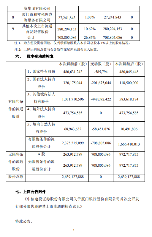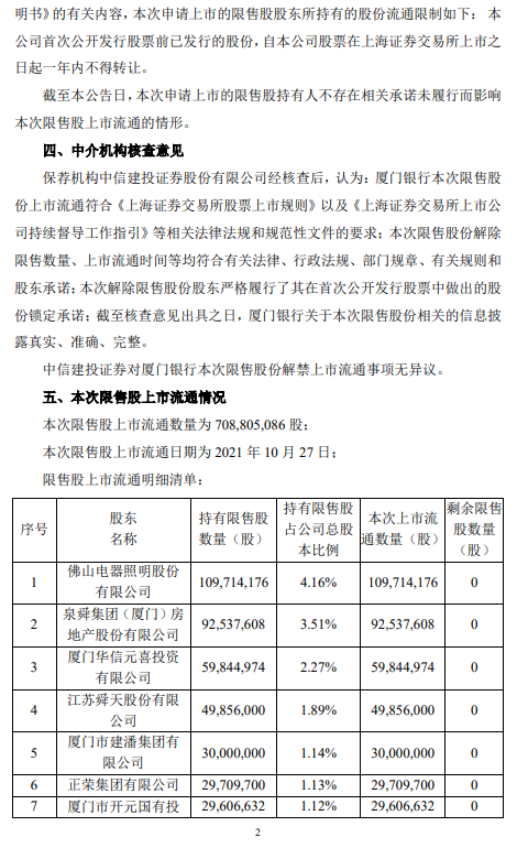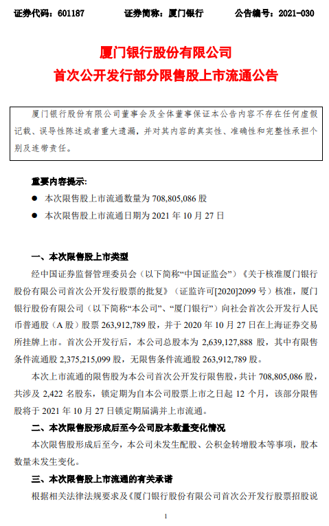 10月21日消息,厦门银行公告,此次限售股上市流通数量为7.09亿股,此次限售股上市流通日期为2021年10月27日。