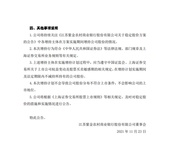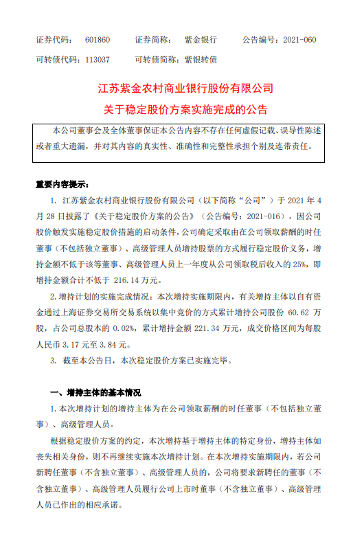 紫金银行增持主体累计增持60.62万股 稳定股价方案实施完成