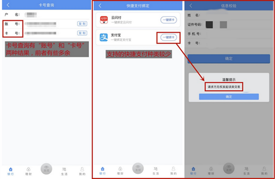 此外,App虽然支持“卡号查询”,但查询结果包括账户、卡号,对普通用户来说意义不大,也不是同业惯用做法;同时,App支持一键绑卡,但仅支持云闪付、支付宝的快捷绑定,且bug非常多。另外,App依然不支持资产/负债查询。