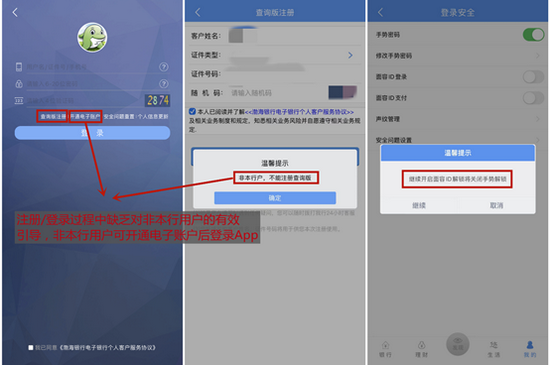与去年评测时相比,渤海银行App注册/登录旅程没有改进,与同业仍有较大差距。渤海银行App支持本行用户进行查询版注册,非本行用户需要自己找到“开通电子账户”进行开户后登录——既缺乏有效指引,更没有实现注册和绑卡流程分离。