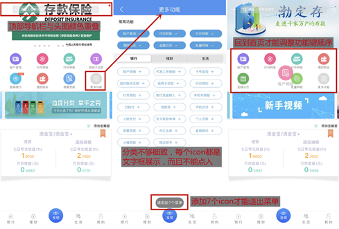 但遗憾的,App整体交互架构亟待提升,诸如银行、理财频道依然是较为原始的列表式,用户需要通过“理财→本行理财→理财购买→选择购买账户→理财产品”的步骤,才能看到理财产品,交互层级过于复杂,考验用户的耐心。