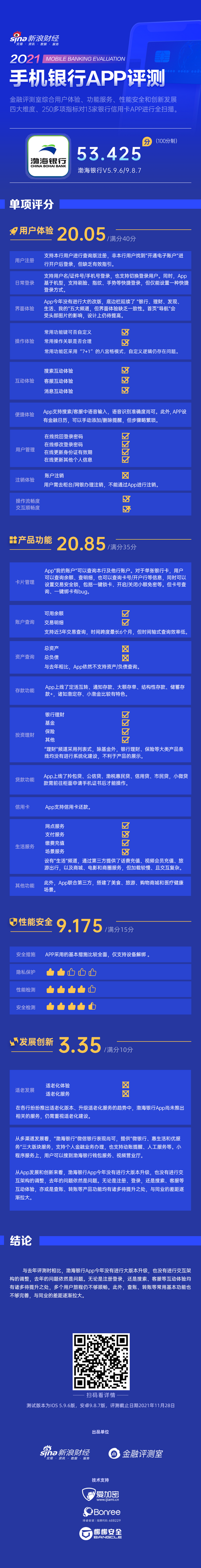 新浪金融评测室综合用户体验、产品功能、性能安全、创新发展4大维度,250余项细分指标对渤海银行手机银行App进行全扫描,最终给予53.425分(总分100)。
