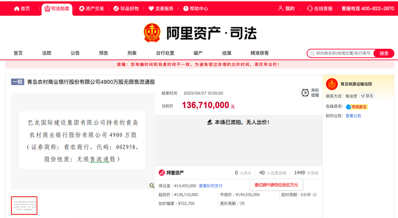9月27日,阿里司法拍卖网显示,巴龙国际建设集团有限公司(下称巴龙国际建设)持有的青岛农村商业银行股份有限公司(下称青农商行,002958)4900万无限售流通股在该平台拍卖,起拍价约1.37亿元。该场拍卖共1449次围观,40人设置提醒,却无人报名。