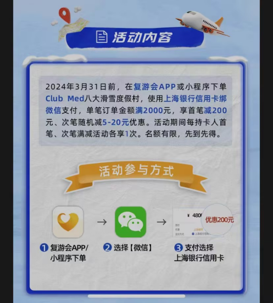 商业银行亦紧跟滑雪热潮。记者日前从上海银行获悉,该行联手复游会,推出clubmed境内外8大滑雪度假村满减优惠。具体来看,2024年3月31日前,在复游会APP或小程序下单clubmed北大壶、亚布力、长白山、太仓、Tomamu、喜乐乐绮境、喜乐乐云栖、佐幌度假村,并使用上海银行信用卡绑微信支付,首次单笔满2000元减200元、次笔随机减5-20元。