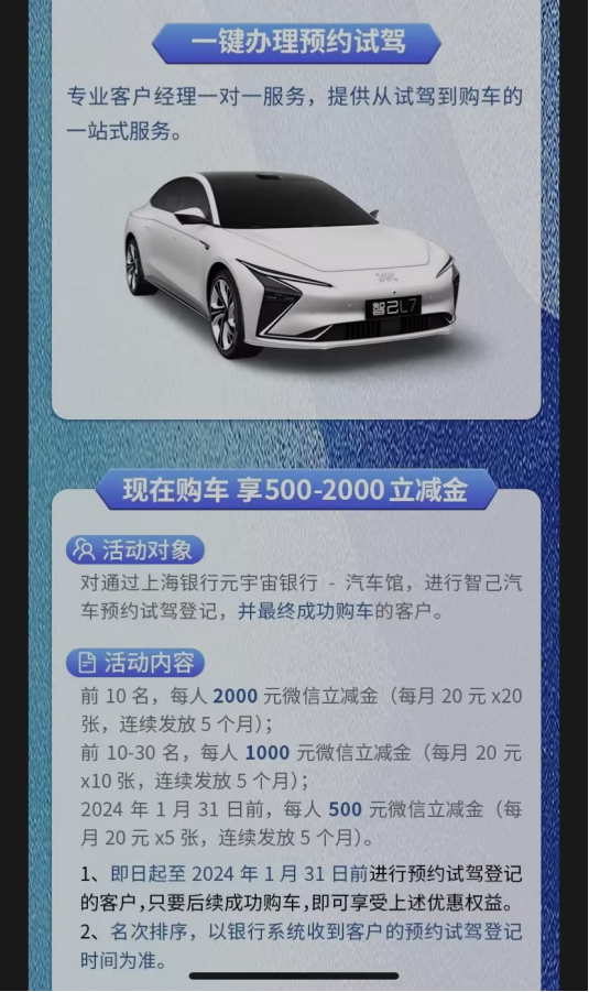 依托近年来数字金融建设,上海银行正为有计划购置新能源车的用户,正打造全新购车试驾体验。该行元宇宙银行汽车馆首发上线智己三款新能源汽车,在1月31日前,可享受最高2000元微信立减金。