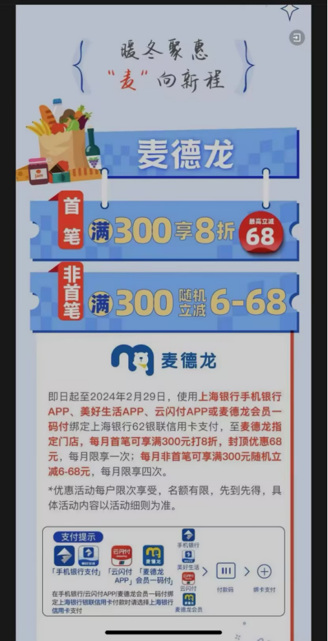 据悉,活动期间的每周五,在麦当劳全国指定活动门店/APP/支付宝小程序,使用支付宝绑定上海银行信用卡,在肯德基指定门店或使用肯德基APP/小程序点餐,使用该行信用卡支付,可享45元减20元、平日随机立减。