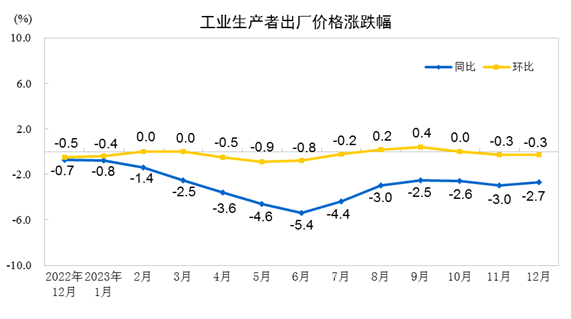 2023年12月份工业生产者出厂价格同比下降2.7% 环比下降0.3%