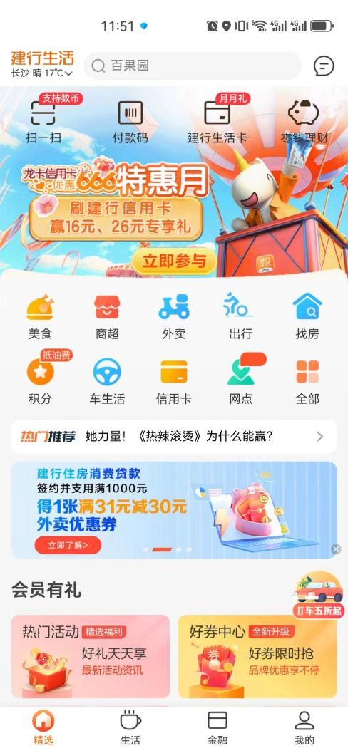 年轻群体作为新市民的代表,是融入城市发展的“新鲜血液”,更是城市消费的生力军。建行湖南分行借助“建行生活”APP,将湖南省各城市特色热门商圈纳入平台运营,并联合高德、美团、中石化等多领域头部企业开展五折打车、1元外卖、加油立减等多样化权益活动,打造多样化金融生态场景,更好地满足新市民消费升级需求。