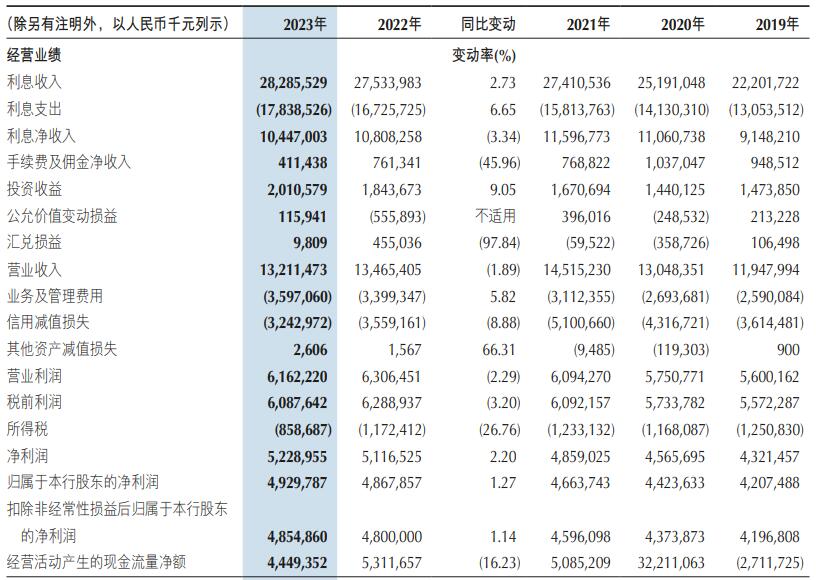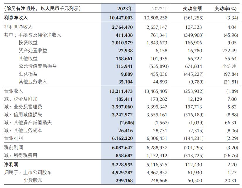 2023年,重庆银行利息净收入为104.47亿元,较上年减少3.61亿元,降幅3.34%;手续费及佣金净收入为4.11亿元,较上年减少3.50亿元,降幅45.96%;公允价值变动损益及投资收益21.27亿元,较上年增加8.39亿元,增幅65.13%;业务及管理费为35.97亿元,较上年增加1.98亿元,增幅5.82%;信用减值损失为32.43亿元,较上年下降3.16亿元,降幅8.88%。