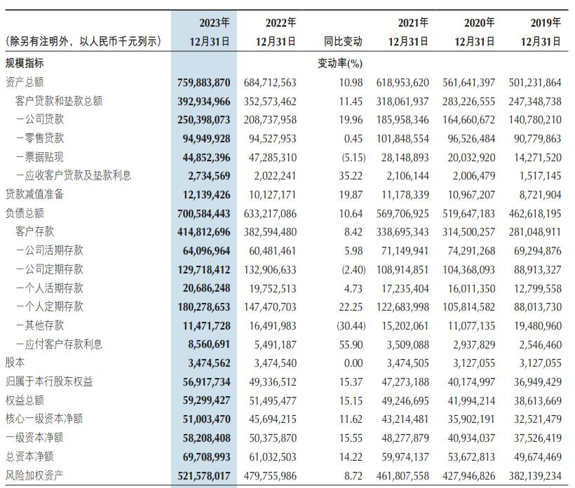 截至2023年12月31日,重庆银行资产总额7,598.84亿元,较上年末增加751.71亿元,增幅10.98%;贷款总额3,929.35亿元,较上年末增加403.62亿元,增幅11.45% ;存款总额4,148.13亿元,较上年末增加322.18亿元,增幅8.42%。