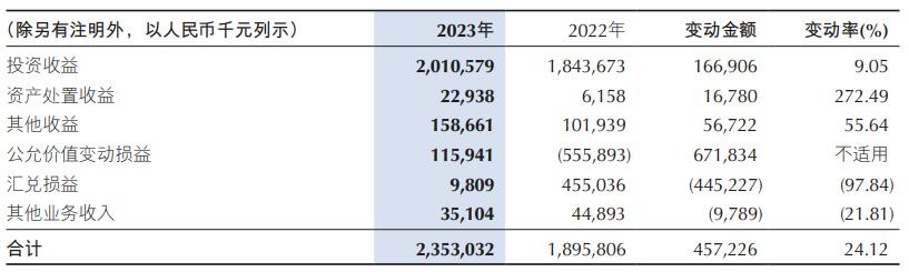 2023年,重庆银行实现其他非利息收入23.53亿元,较上年增加4.57亿元,增幅24.12%。其中,投资收益20.11亿元,较上年末增加1.67亿元,主要是本年处置债券产生的投资收益增加所致;公允价值变动损益1.16亿元,较上年末增加6.72元,主要是交易性金融资产估值较上年回升所致;汇兑损益0.1亿元,较上年末减少4.45亿元,主要是该行发行的美元优先股到期赎回,持有美元头寸下降导致汇兑收益减少。