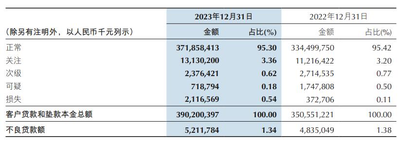 2023年12月31日,重庆银行不良贷款余额为52.12亿元,较上年末上升3.77亿元;不良贷款率为1.34%,较上年末下降0.04个百分点;关注类贷款占比3.36%,较上年末上升0.16个百分点。