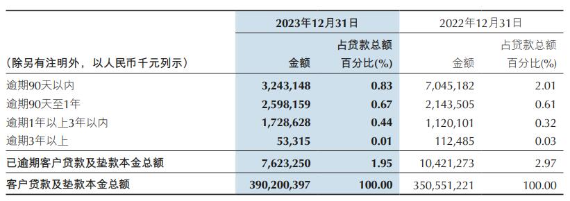 截至2023年12月31日,重庆银行逾期贷款总额为76.23亿元,较上年末下降27.98亿元;逾期贷款总额占客户贷款及垫款本金总额的比例为1.95%,较上年末下降1.02个百分点。