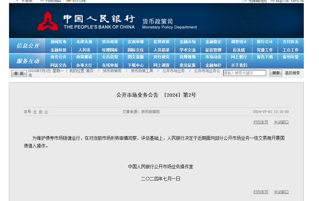 中新网7月1日电 据中国人民银行网站消息,为维护债券市场稳健运行,在对当前市场形势审慎观察、评估基础上,人民银行决定于近期面向部分公开市场业务一级交易商开展国债借入操作。